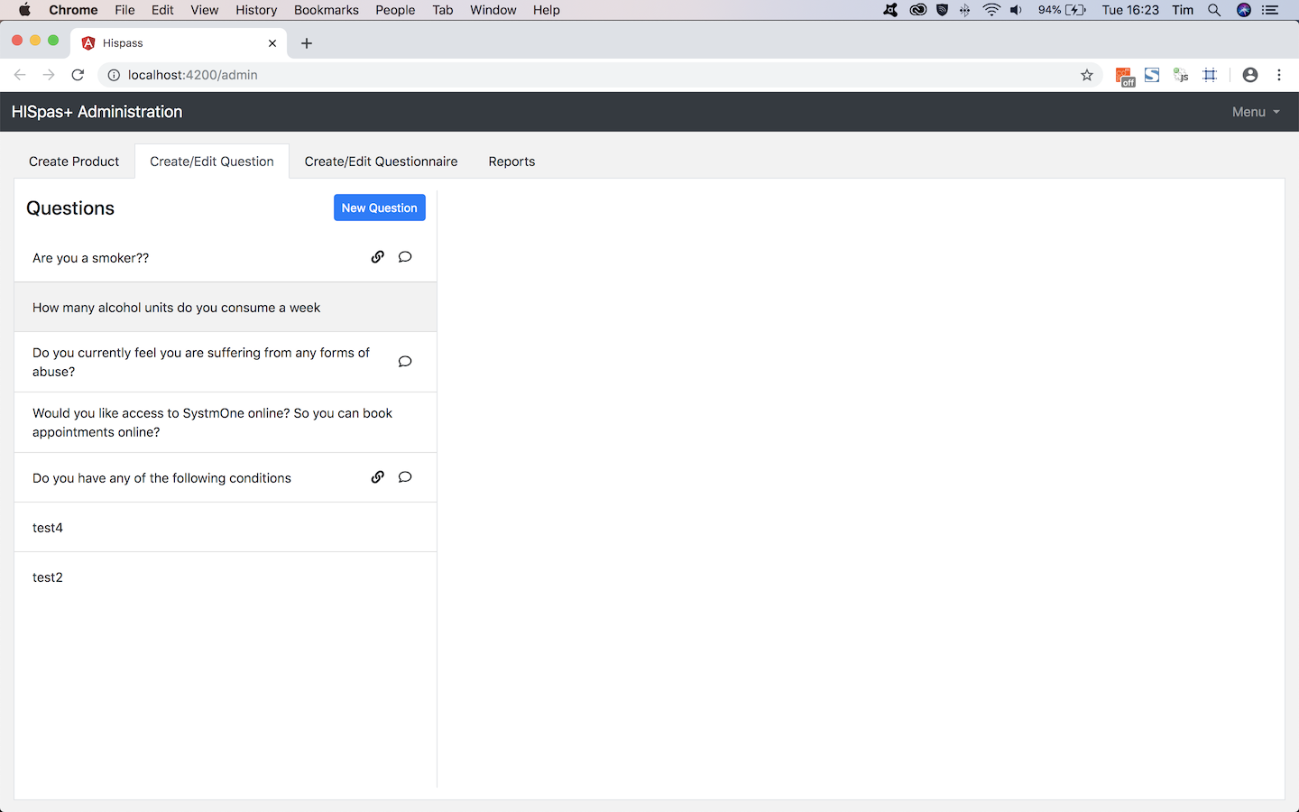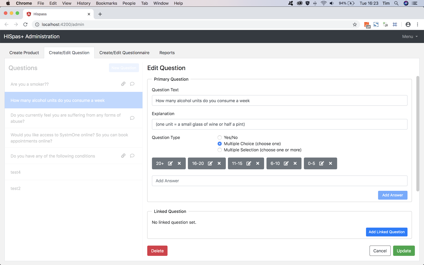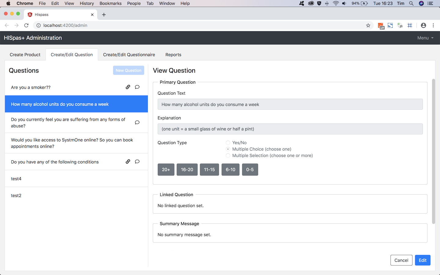 A touch screen web application for GP practices to survey patients and offer suggested pathways depending on the answers given. The project also included development of an admin web application to edit questions and view responses.