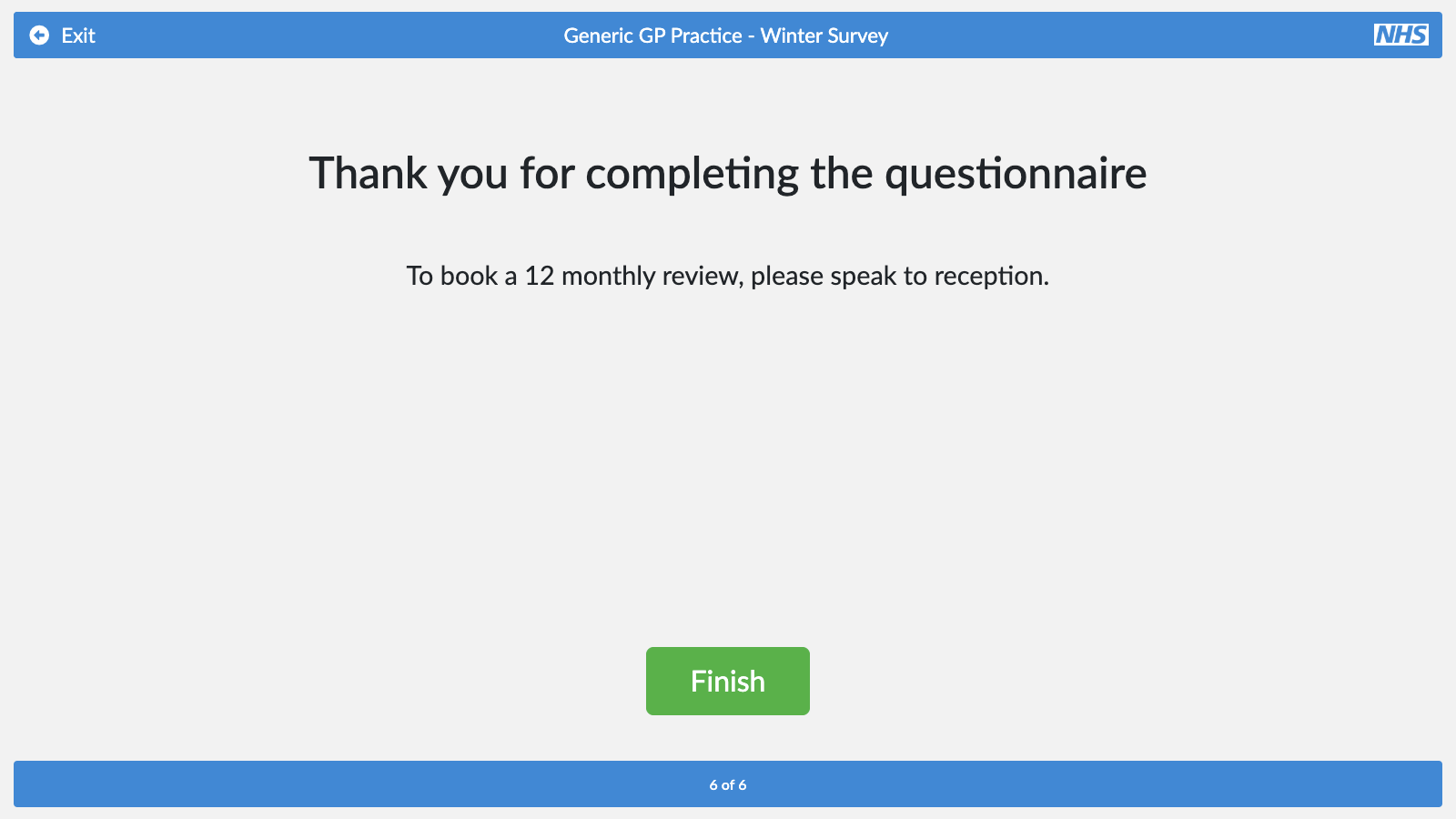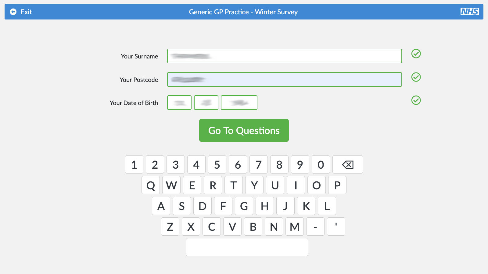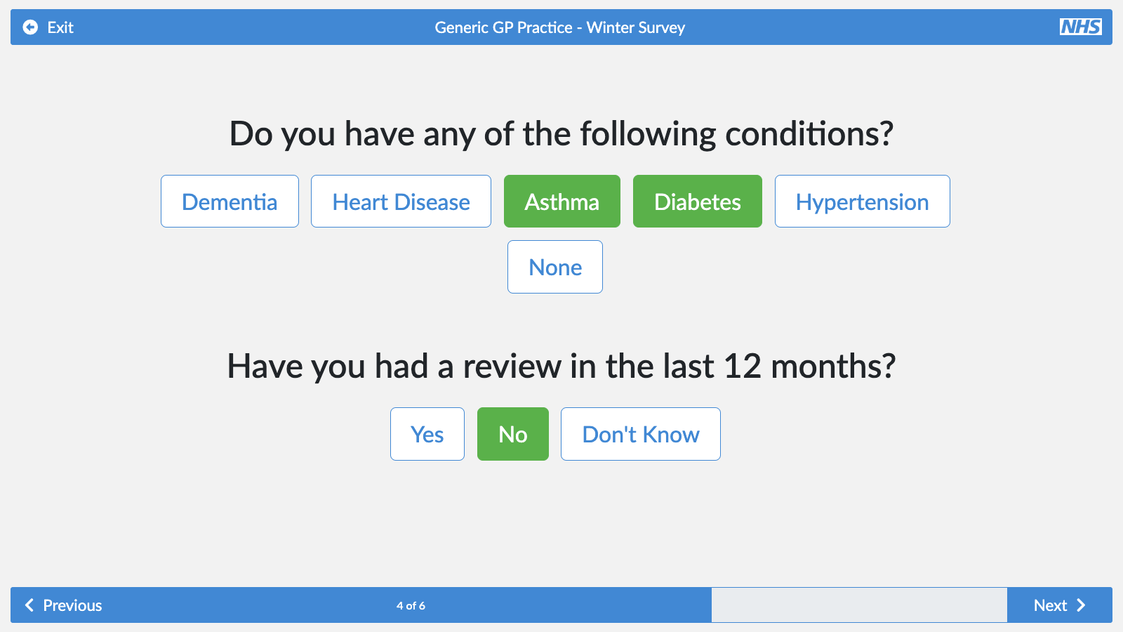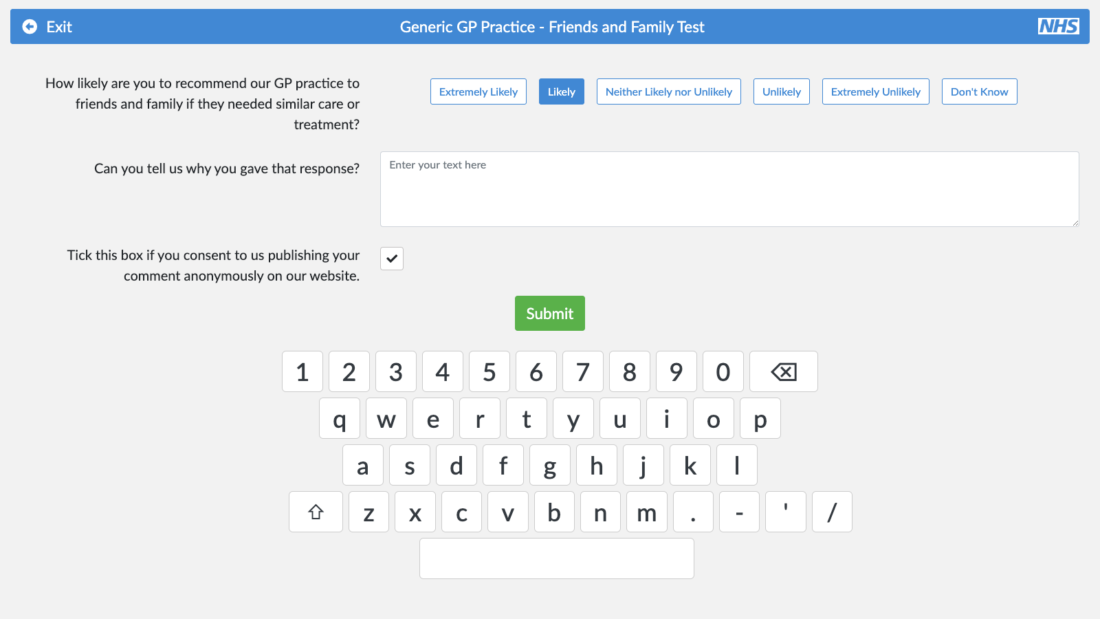 In this case the software leverages touchscreen panels installed in GP practices for patient check-in, and provides options for completion of the ubiquitous friends and family test, and an optional survey.